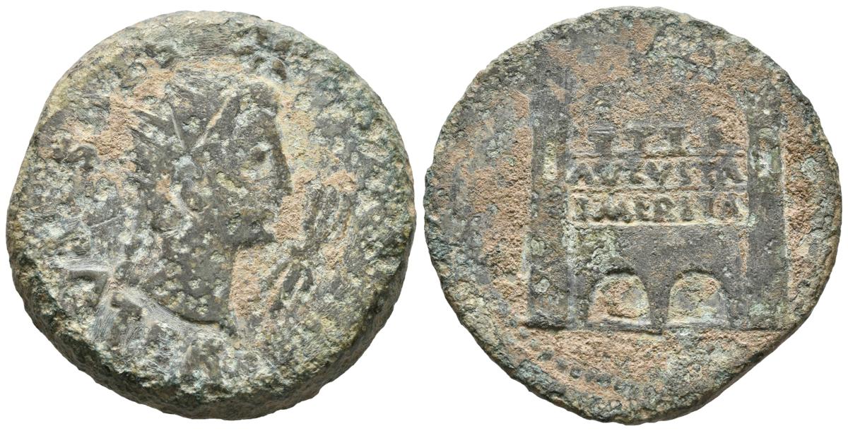 EMERITA AUGUSTA. Dupondio. Epoca de Tiberio 14-36 d.C. Mérida (Badajoz). A/ Cabeza radiada de Augusto a derecha, delante fulmen, leyenda externa DIVVS. AVGVSTVS. PATER. R/ Puerta de la ciudad, sobre ella AVGVSTA EMERITA. FAB-1027. Ae. 21,41g. BC/MBC. Escasa.
