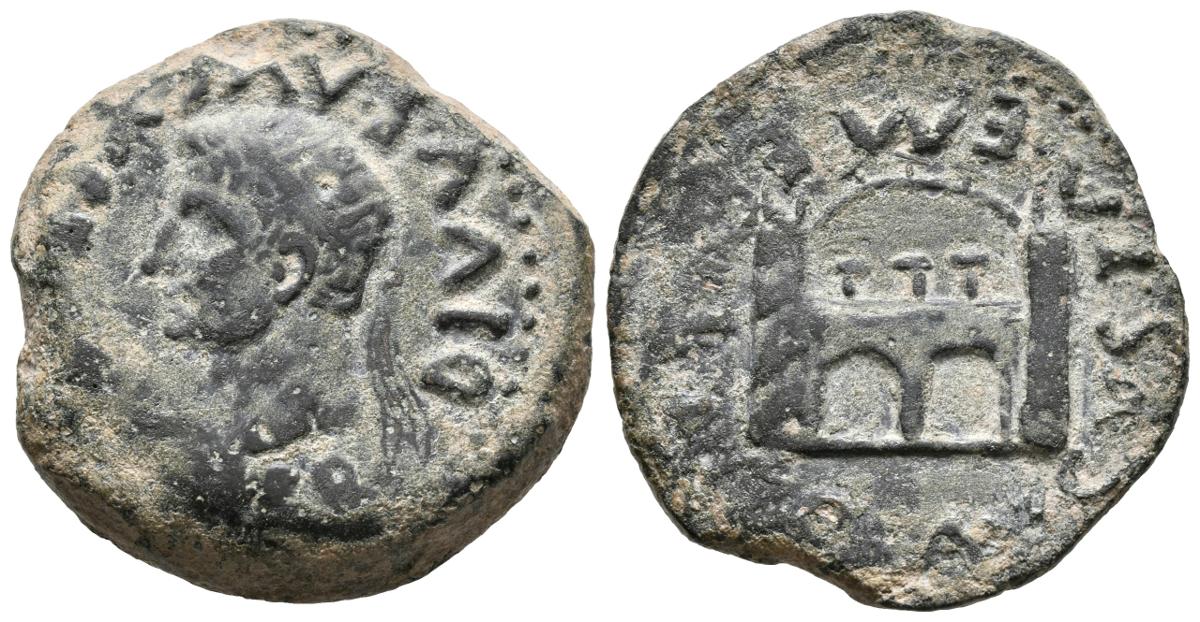EMERITA AUGUSTA. As. Epoca de Tiberio 14-36 d.C. Mérida (Badajoz). A/ Cabeza laureada de Augusto a izquierda, leyenda externa DIVVS. AVGVSTVS. PATER. R/ Puerta de la ciudad, alrededor COL. AVGVSTA · EMERITA. FAB-1043. Ae. 13,75g. MBC+.