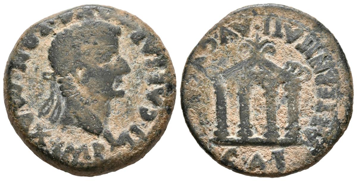 EMERITA AUGUSTA. As. Epoca de Tiberio. 14-36 a.C. Mérida (Badajoz). A/ Cabeza laureada de Tiberio a derecha. TI. CAESAR AVG. PONT. MAX. IMP. R/ Templo tetrástilo. AETERNITATI AVGVSTAE, debajo C. A. E. FAB-1062. Ae. 12,31g. MBC-.