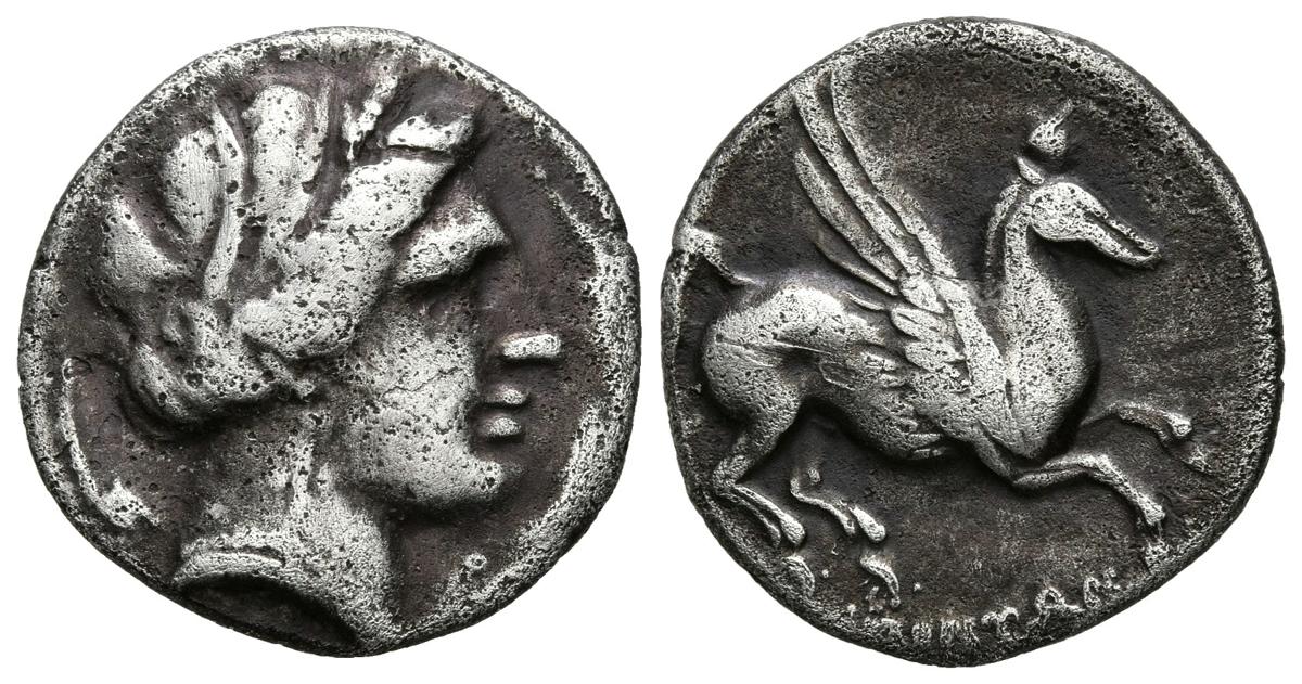 EMPORITON. Dracma. Sant Martí de Ampurias (Gerona). 220-150 a.C. A/ Cabeza femenina a derecha con tres delfines a su alrededor. R/ Pegaso a derecha, debajo leyenda griega EMPORITON. FAB-1101; ACIP 164. Ar. 4,55g. MBC.