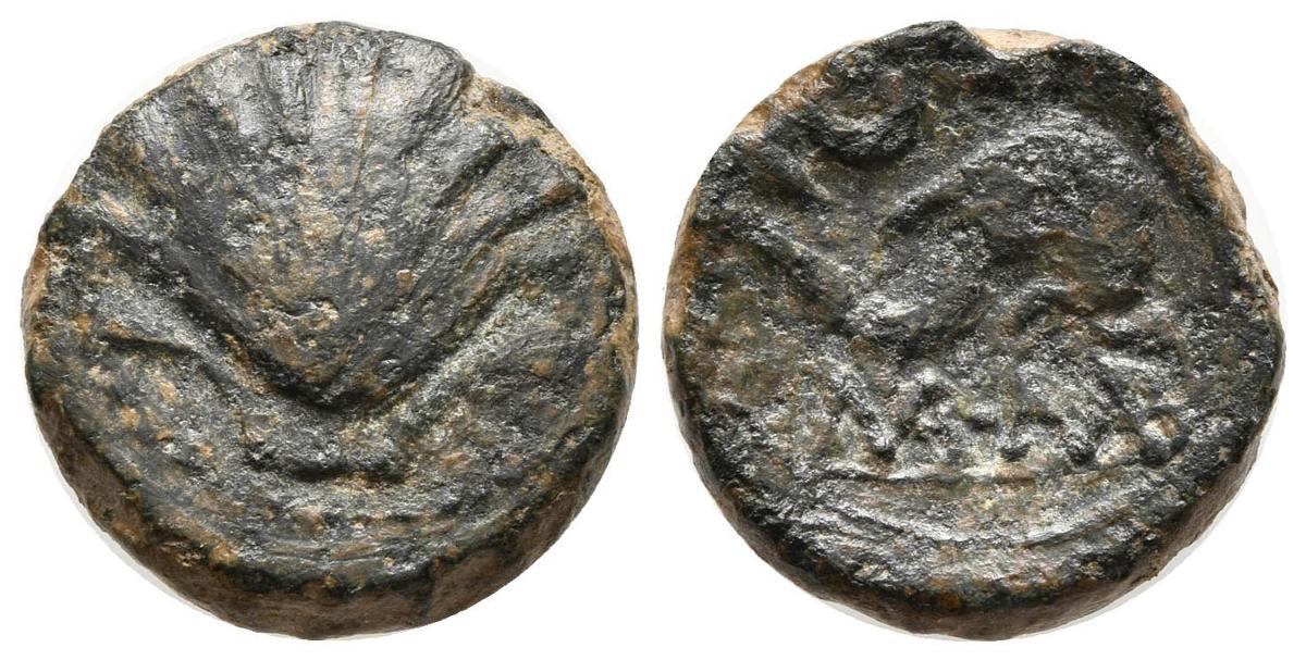 ARSE-SAGUNTO. Cuadrante. 170-20 a.C. Sagunto (Valencia). A/ Concha. R/ Delfín a derecha, encima creciente, debajo MA·MAB. FAB-2061. Ae. 3,97g. MBC-.
