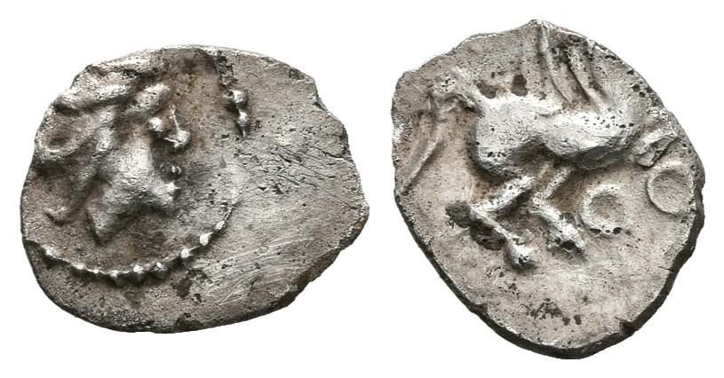 EMPORITON. Hemitritartemorión. Sant Martí de Ampurias (Gerona). 450-400 a.C. A/ Cabeza femenina con tocado a derecha. R/ Pegaso volando a derecha, debajo dos roeles. FAB-1197. Ar. 0,14g. MBC+.