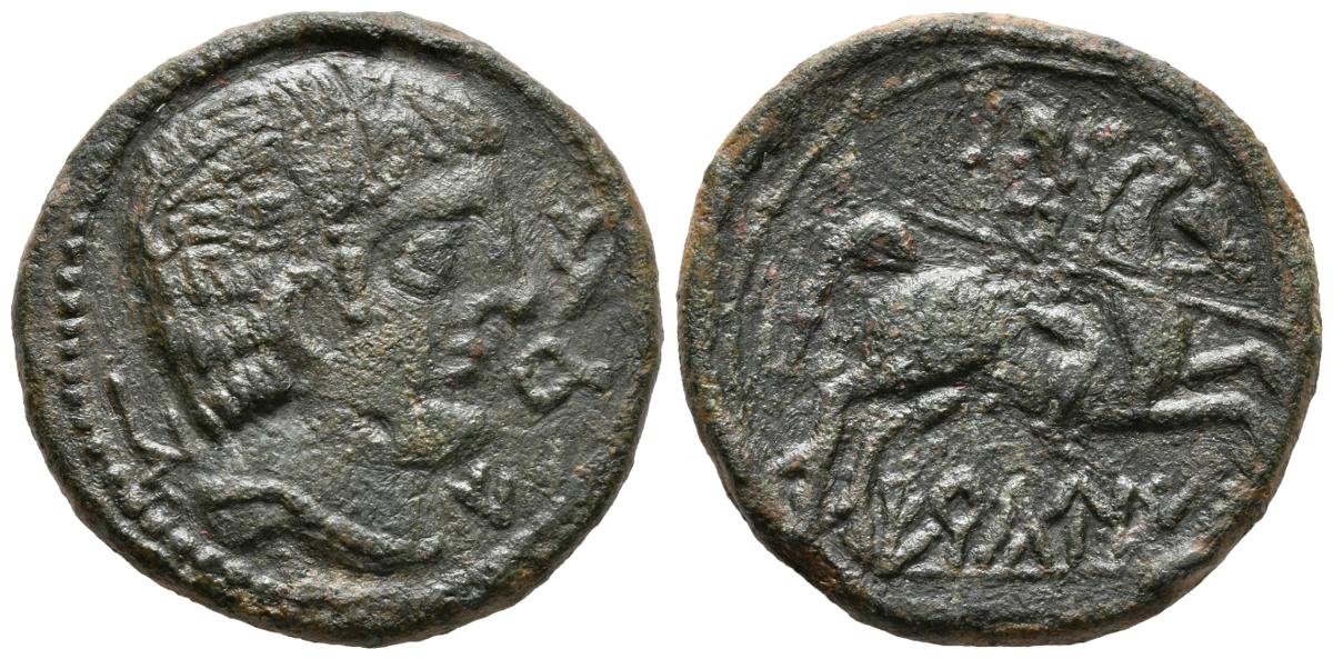 ERCAUICA. As. 120-20 a.C. Cañaveruelas (Cuenca). A/ Cabeza masculina a derecha, detrás arado, delante delfín y letras ibéricas ER. R/ Jinete con lanza a derecha, debajo sobre línea, leyenda ERCaUICA. FAB-1276. Ae. 12,75g. MBC+. Rara.