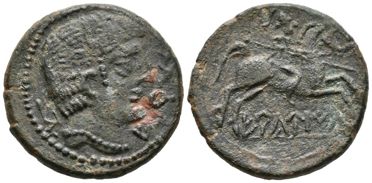 ERCAUICA. As. 120-20 a.C. Cañaveruelas (Cuenca). A/ Cabeza masculina a derecha, detrás arado, delante delfín y letras ibéricas ER. R/ Jinete con lanza a derecha, debajo sobre línea, leyenda ERCaUICA. FAB-1276. Ae. 12,38g. MBC+. Rara.