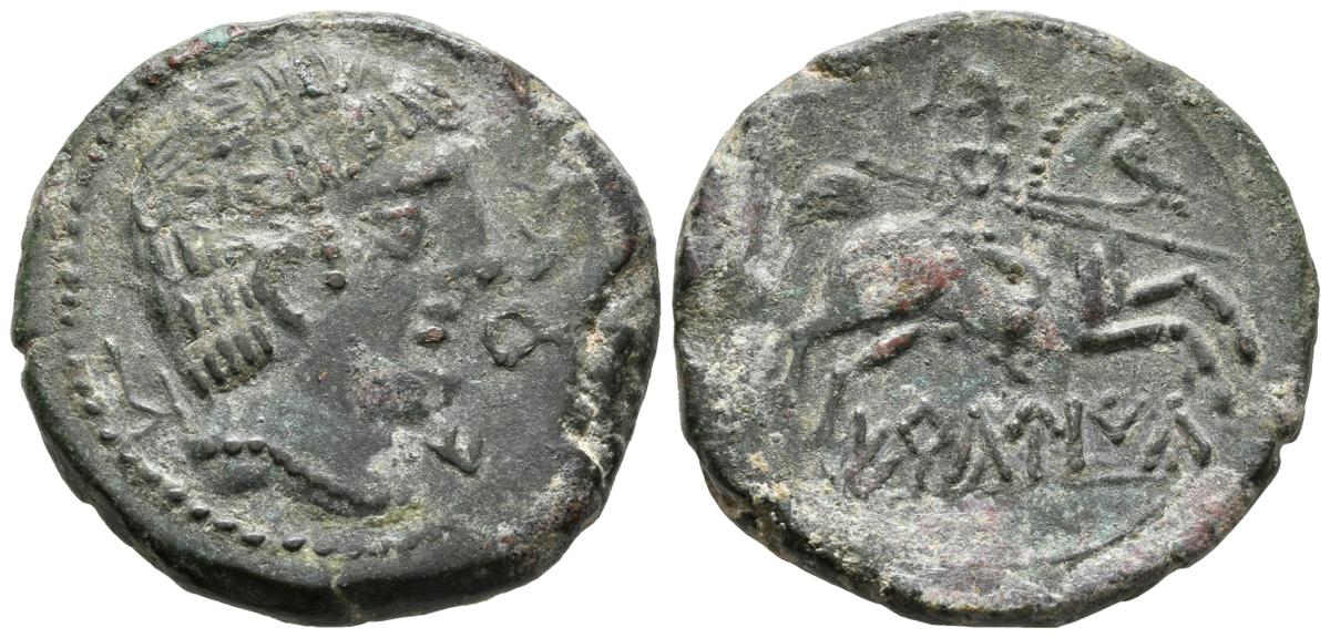 ERCAUICA. As. 120-20 a.C. Cañaveruelas (Cuenca). A/ Cabeza masculina a derecha, detrás arado, delante delfín y letras ibéricas ER. R/ Jinete con lanza a derecha, debajo sobre línea, leyenda ERCaUICA. FAB-1276. Ae. 16,90g. MBC+. Rara.