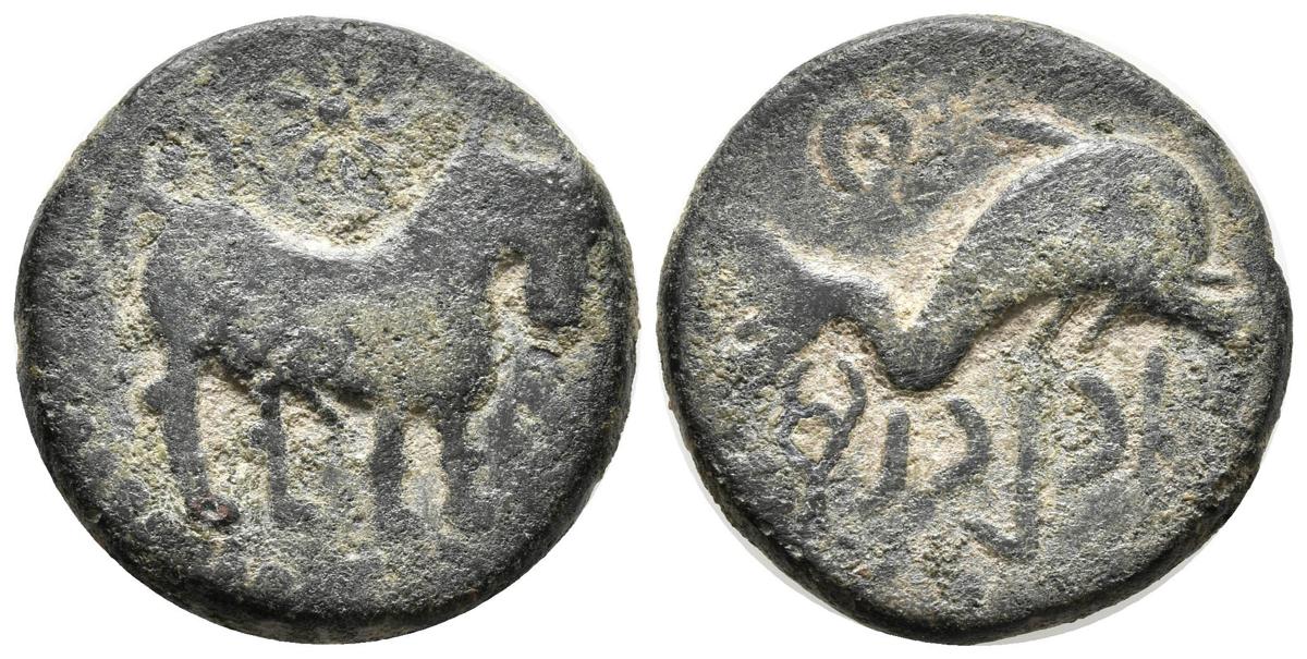 ASIDO. Semis. 50 a.C. Medina Sidonia (Cádiz). A/ Toro a derecha, encima estrella. R/ Delfín a derecha, encima creciente con punto, debajo leyenda libio-fenicia y caduceo. FAB-158. Ae. 8,28g. MBC.