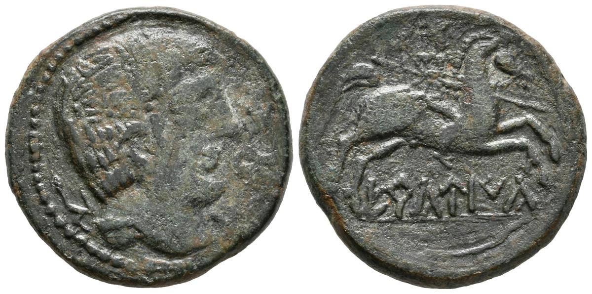 ERCAUICA. As. 120-20 a.C. Cañaveruelas (Cuenca). A/ Cabeza masculina a derecha, detrás arado, delante delfín y letras ibéricas ER. R/ Jinete con lanza a derecha, debajo sobre línea, leyenda ERCaUICA. FAB-1276. Ae. 14,45g. MBC/MBC+. Rara.