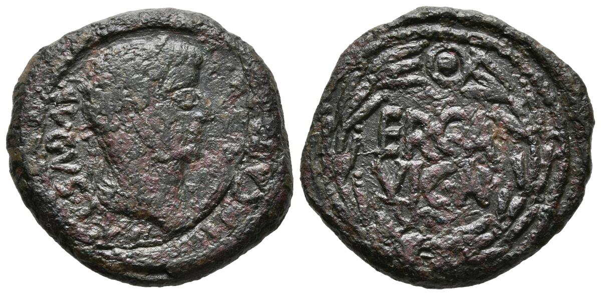ERCAVICA. Semis. Epoca de Tiberio. 14 - 36 d.C. Castro de Santaver (Cuenca). A/ Cabeza laureada de Tiberio a derecha. TI. CAESAR. AVGVSTVS. R/ Láurea, en el centro ERCA-VICA. FAB-1284. Ae. 8,14g. BC/MBC.