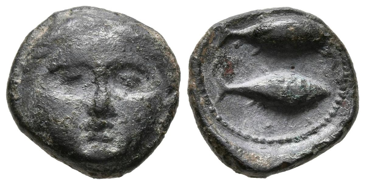 GADES. 1/2 Calco. 300-200 a.C. Cádiz. A/ Cabeza frontal de Helios. R/ Dos atunes a derecha. FAB-1333. Ae. 2,07g. MBC+.
