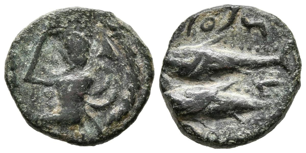 GADES. Semis. 100-20 a.C. Cádiz. A/ Cabeza de Hércules con piel de león a izquierda, delante clava. R/ Dos atunes a izquierda, encima y debajo leyenda púnica tipo B, entre ambos creciente con punto y letra Alef. FAB-1347. Ae. 2,63g. Cospel pequeño. MBC-.