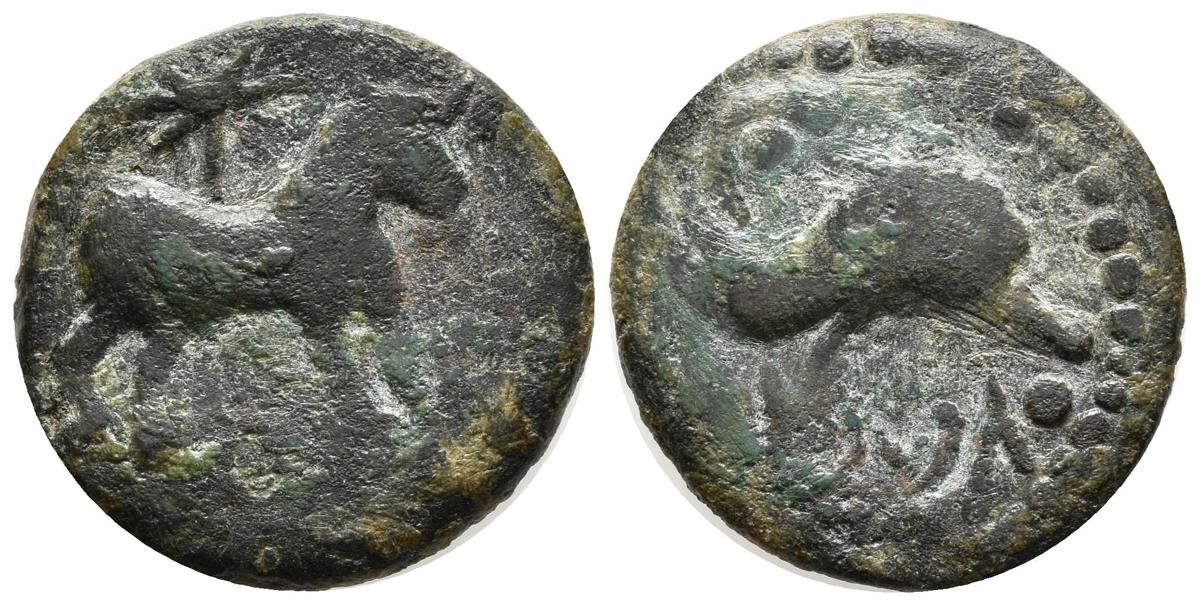 ASIDO. Semis. 50 a.C. Medina Sidonia (Cádiz). A/ Toro a derecha, encima estrella. R/ Delfín a derecha, encima creciente con punto, debajo leyenda libio-fenicia y caduceo. FAB-158. Ae. 7,03g. MBC-.