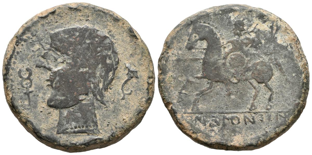 ICALCUNSCEN. As. 120-20 a.C. Iniesta (Cuenca). A/ Cabeza masculina a izquierda, delante caduceo, detrás delfín. R/ Jinete con lanza y rodela a izquierda, debajo ICaLCuNSCeN. FAB-1416. Ae. 22,65g. MBC-. Escasa.