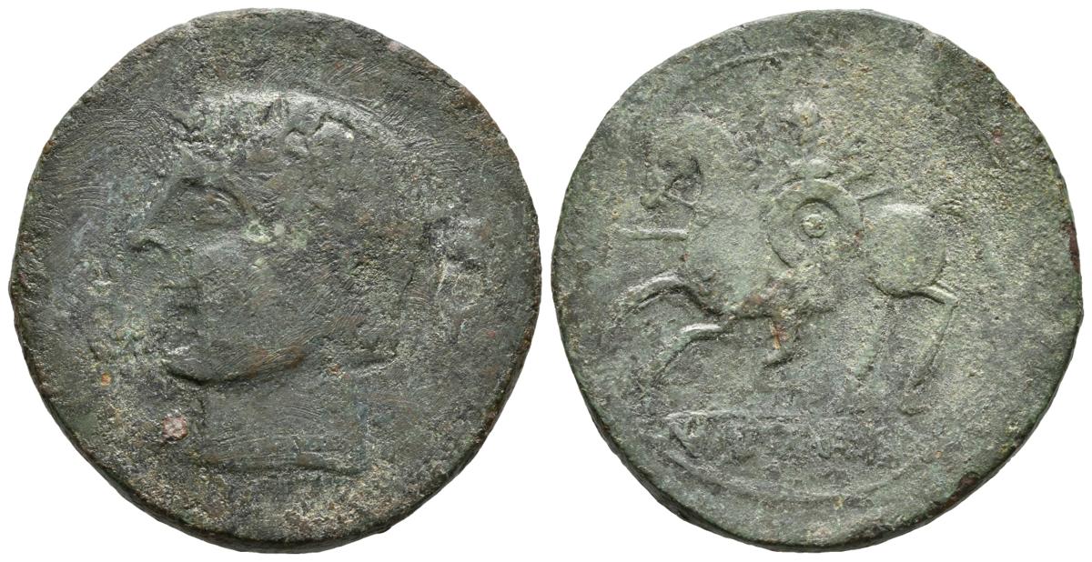 ICALCUNSCEN. As. 120-20 a.C. Iniesta (Cuenca). A/ Cabeza masculina a izquierda, delante caduceo, detrás delfín. R/ Jinete con lanza y rodela a izquierda, debajo ICaLCuNSCeN. FAB-1416. Ae. 20,90g. BC+/MBC-. Escasa.