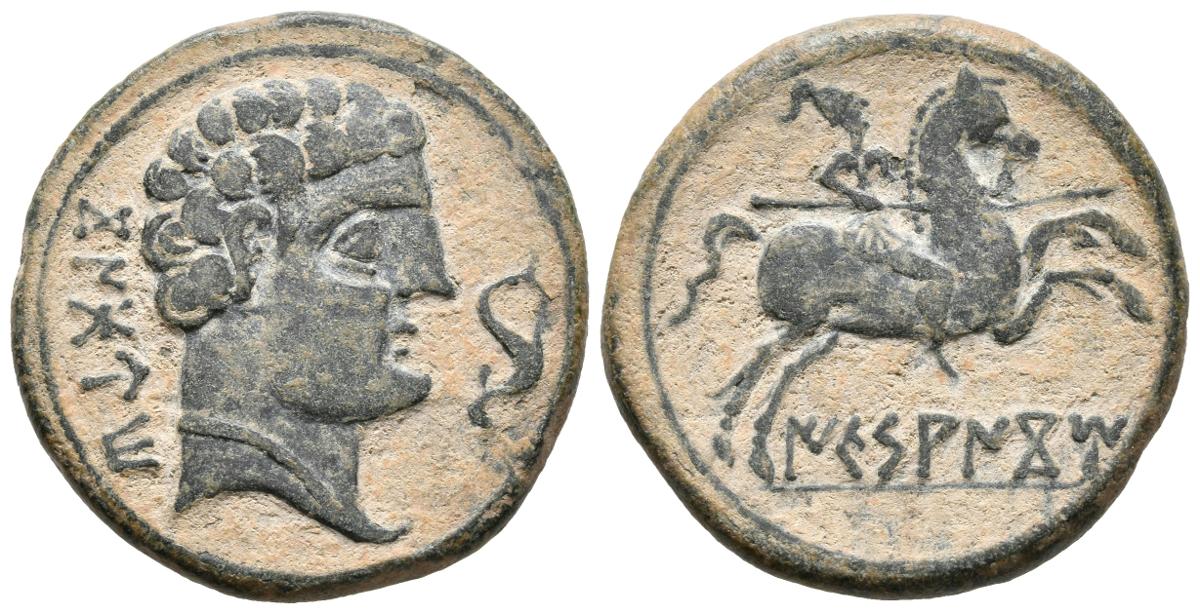 ICESANCOM. As. 120-20 a.C. Alcalá de Henares (Madrid). A/ Cabeza masculina a derecha, delante delfín, detrás leyenda CoNBoUTo. R/ Jinete con lanza a derecha, debajo leyenda ICeSANCoM. FAB-1421. Ae. 9,35g. Buen ejemplar. MBC+.