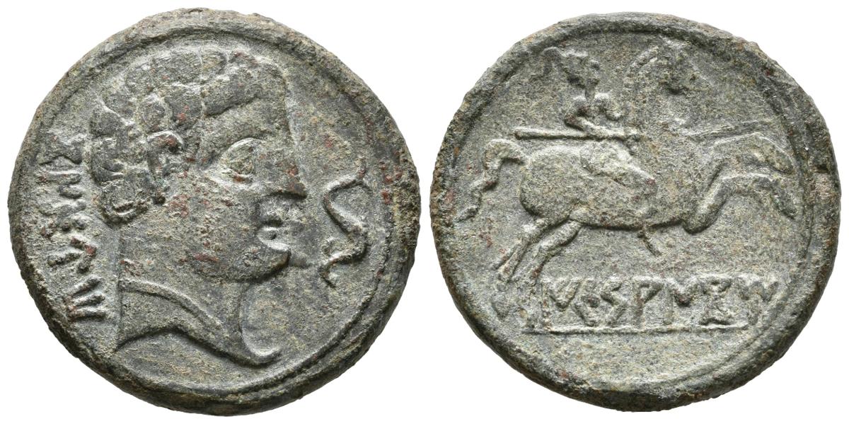 ICESANCOM. As. 120-20 a.C. Alcalá de Henares (Madrid). A/ Cabeza masculina a derecha, delante delfín, detrás leyenda CoNBoUTo. R/ Jinete con lanza a derecha, debajo leyenda ICeSANCoM. FAB-1421. Ae. 10,41g. MBC+.