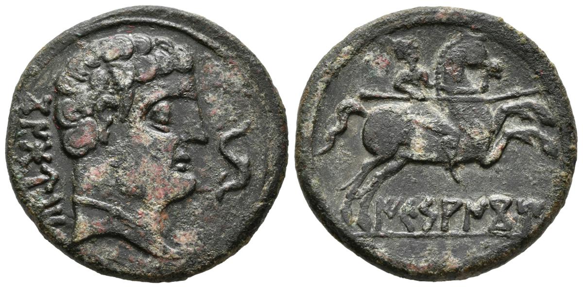 ICESANCOM. As. 120-20 a.C. Alcalá de Henares (Madrid). A/ Cabeza masculina a derecha, delante delfín, detrás leyenda CoNBoUTo. R/ Jinete con lanza a derecha, debajo leyenda ICeSANCoM. FAB-1421. Ae. 9,25g. Oxidaciones limpiadas en anverso. MBC/MBC+.