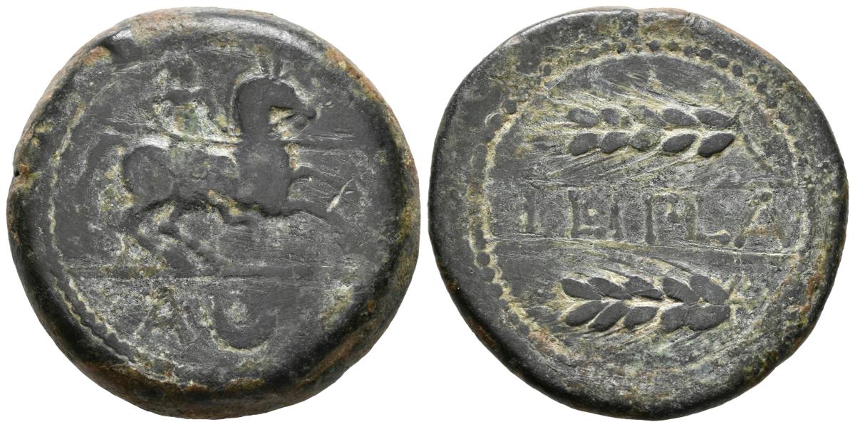 ILIPLA. As. 50 a.C. Niebla (Huelva). A/ Jinete con lanza a derecha, debajo A y creciente. R/ Leyenda ILIPLA entre líneas y dos espigas a izquierda. FAB-1556. Ae. 27,66g. MBC-/MBC. Muy escasa.
