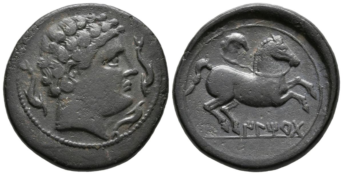 ILTIRTA. Semis (serie pesada). 220-200 a.C. Lleida (Cataluña). A/ Cabeza masculina a derecha, alrededor tres delfines. R/ Caballo a rienda suelta a derecha, encima creciente, debajo leyenda ILTiRTa. FAB-1462. Ae. 10,83g. Buen ejemplar. MBC+/EBC-. Rara.