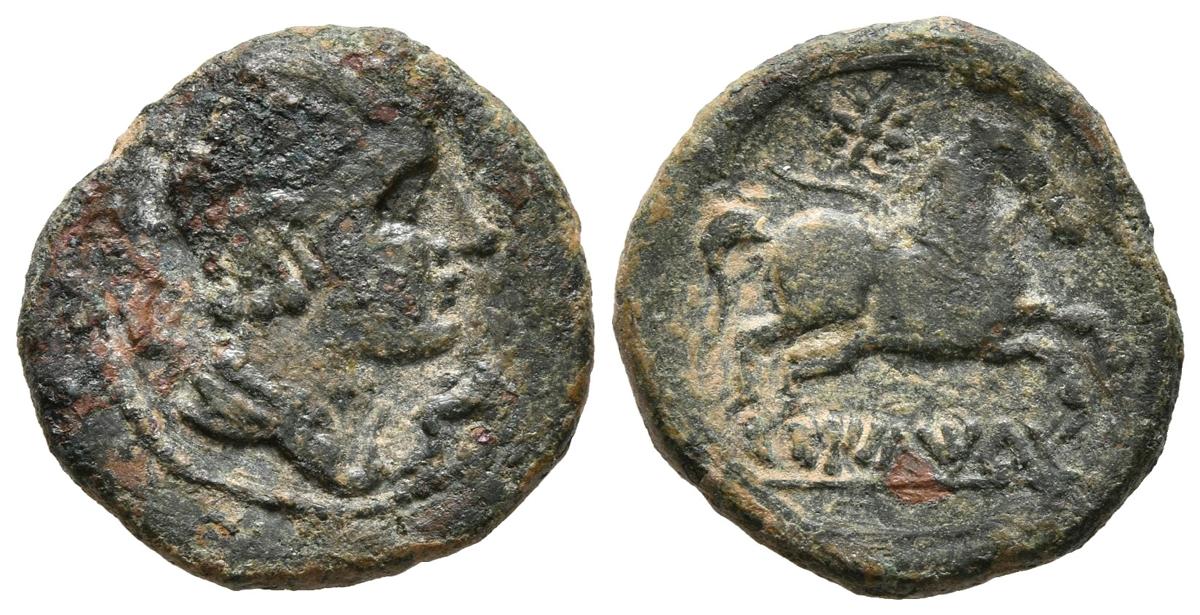 ILTIRTA. Semis. 220-200 a.C. Lleida (Cataluña). A/ Cabeza masculina con collar y manto a derecha, alrededor tres delfines. R/ Caballo con rienda suelta galopando a derecha, encima estrella, debajo leyenda ILTIRTa. FAB-1463. Ae. 3,30g. MBC-/MBC. Rara.
