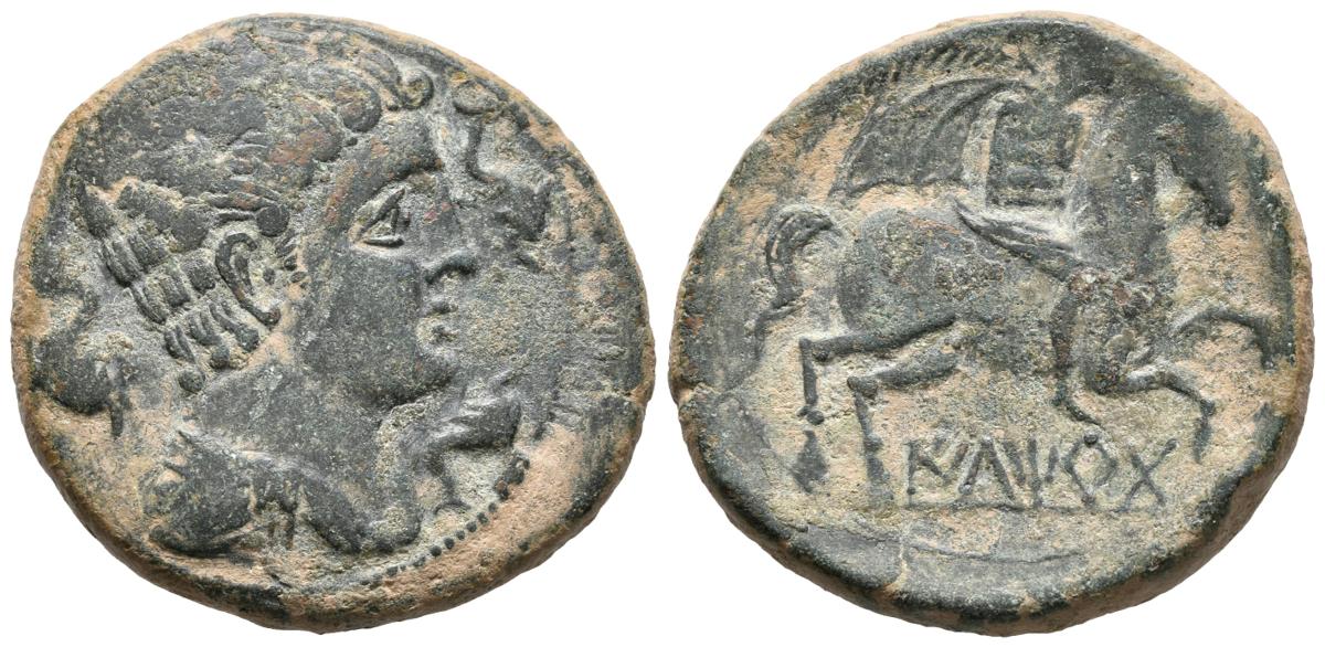 ILTIRTA. As. 220-200 a.C. Lleida (Cataluña). A/ Cabeza masculina con manto y fíbula a derecha, alrededor tres delfines. R/ Jinete con palma a derecha, debajo sobre exergo ILTiRTa. FAB-1465. Ae. 16,83g. MBC.