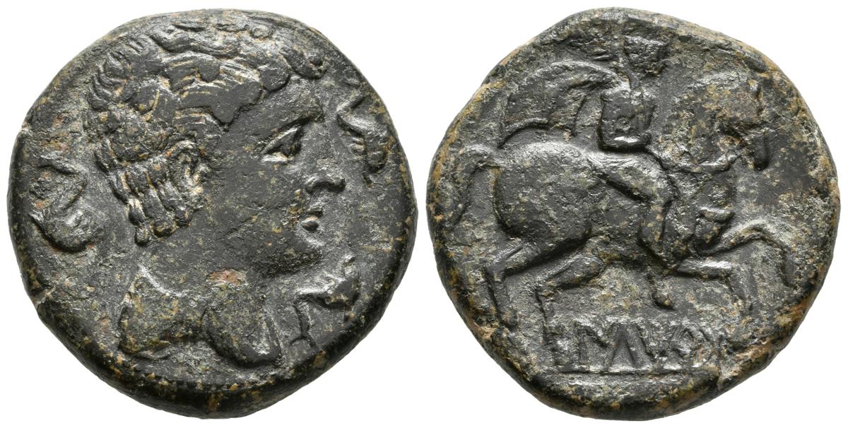 ILTIRTA. As. 220-200 a.C. Lleida (Cataluña). A/ Cabeza masculina con manto y fíbula a derecha, alrededor tres delfines. R/ Jinete con palma a derecha, debajo sobre exergo ILTiRTa. FAB-1465. Ae. 16,39g. MBC+.