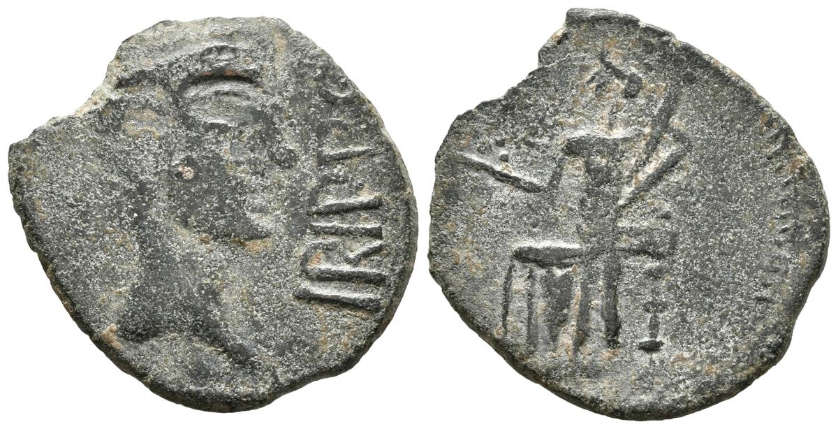 IRIPPO. As. 30 a.C. Cercanías de Sevilla. A/ Cabeza de ¿Octavio? a derecha, delante leyenda externa IRIPPO, alrededor láurea. R/ Deidad femenina sentada a derecha con piña y cornucopia rodeada de láurea. FAB-1581. Ae. 4,62g. MBC/MBC+.
