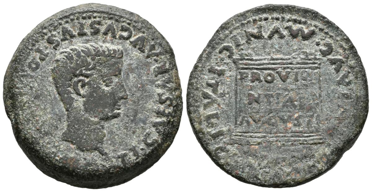 ITALICA. As. Epoca de Tiberio. 14-36 a.C. Santiponce (Sevilla) A/ Cabeza desnuda de Tiberio a derecha, alrededor IMP TI CAESAR AVGVSVS PON MAX. R/ Ara con leyenda PROVIDENTIAE AVGVSTI, alrededor PERM DIVI AVG MVNIC ITALIC. FAB-1593. Ae. 15,20g. MBC.