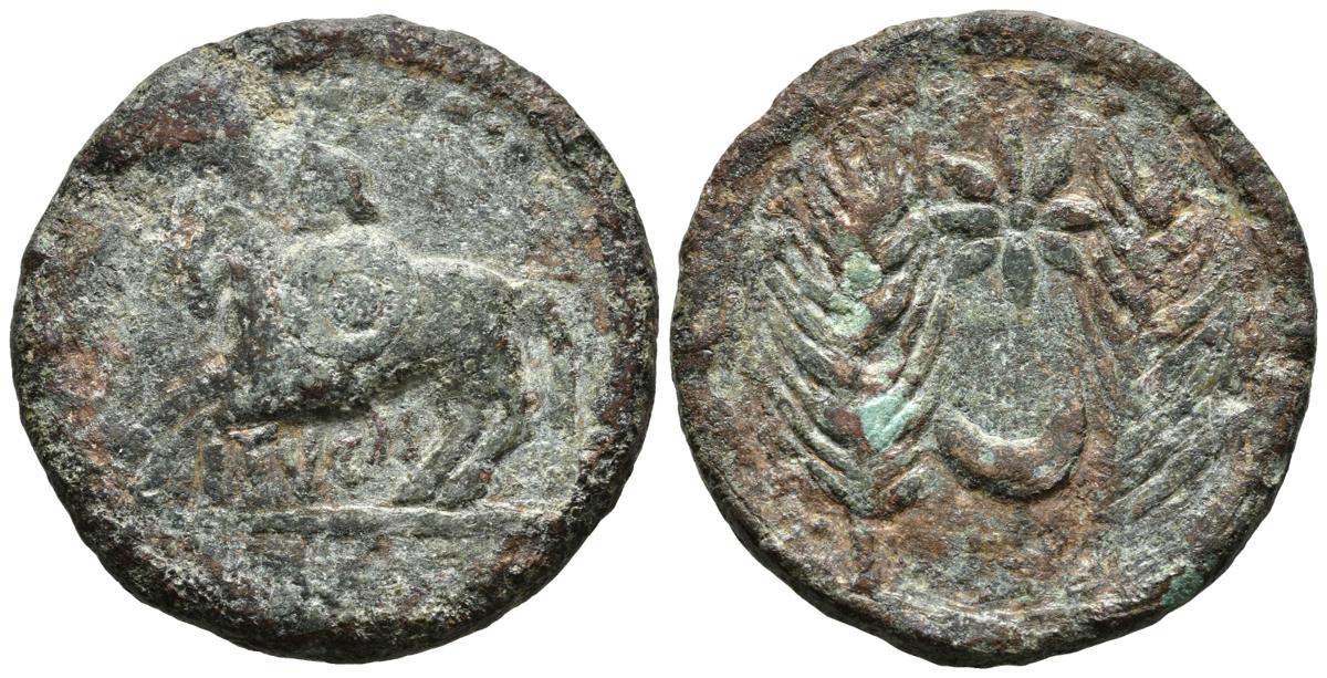 ITUCI. Dupondio. 150-50 a.C. Tejada la Vieja (Sevilla). A/ Jinete con rodela a izquierda, debajo ITVCI. R/ Dos espigas entre ellas creciente y A. FAB-1599. Ae. 18,91g. Rayas por limpieza. MBC-. Rara.