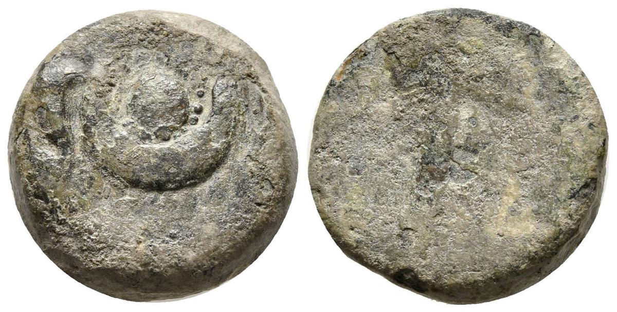 BARIA. Semis. 200-100 a.C. Villaricos (Almería). A/ Ureus con disco solar y entre dos serpientes. R/ Palmera con dos racimos de frutas colgando. FAB-214. Ae. 9,63g. BC. Rara.