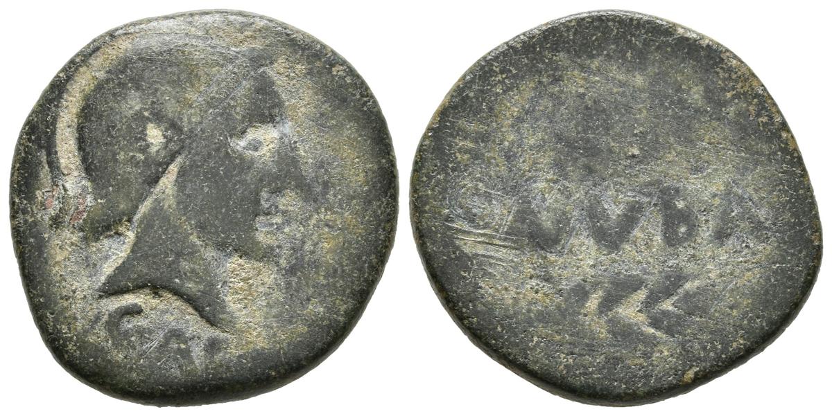 ONUBA. As. 50 a.C. Huelva. A/ Cabeza masculina con casco a derecha, delante leyenda C.CAE(LI Q. PVBLILI). R/ Dos espigas a derecha, entre ellas ONVBA. FAB-1893. Ae. 7,04g. BC. Rara.
