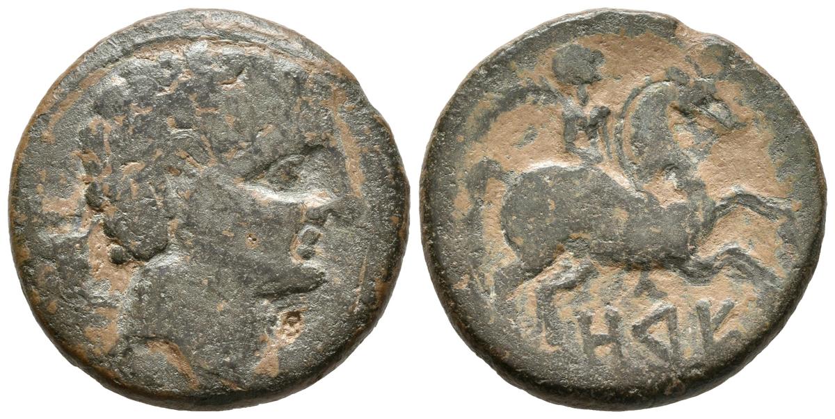ORE. As. 120-20 a.C. Zona de Cataluña. A/ Cabeza masculina a derecha, detrás toro. R/ Jinete con palma a derecha, debajo sobre línea leyenda ORE. FAB-1897. Ae. 10,50g. BC+/MBC-. Escasa.