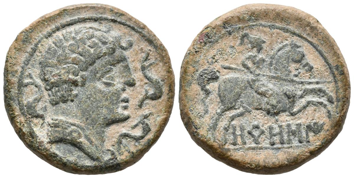 OROSIS. As. 120-20 a.C. Zona media del Ebro. A/ Cabeza masculina a derecha rodeada de tres delfines. R/ Jinete con lanza a derecha, debajo OROSI. FAB-1907. Ae. 12,03g. MBC+.