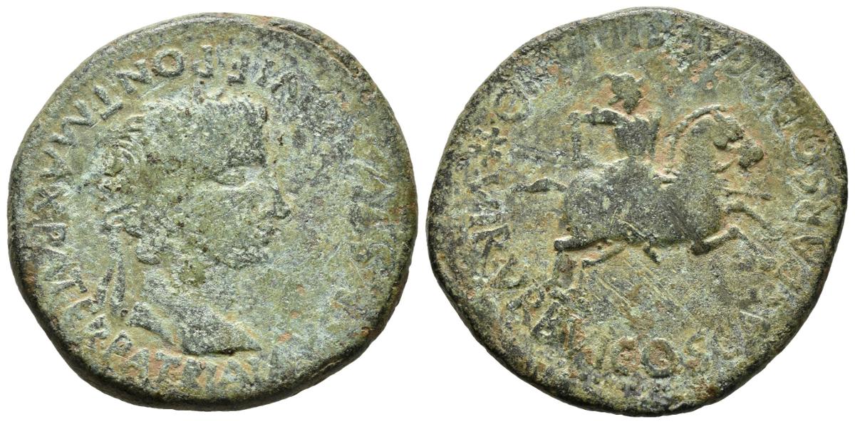 OSCA. As. Epoca de Augusto. 24 a.C.-14 d.C. Huesca. A/ Cabeza laureada de Augusto a derecha. AVGVSTVS. DIVI. F. PONT. MAX. PATER. PATRIAE. R/ Jinete con lanza a derecha, alrededor y sin línea debajo SPARSO. ET. CECILIANO. II. VIR. VRB. VIC. OSCA. FAB-1930. Ae. 12,14g. BC-/BC+.