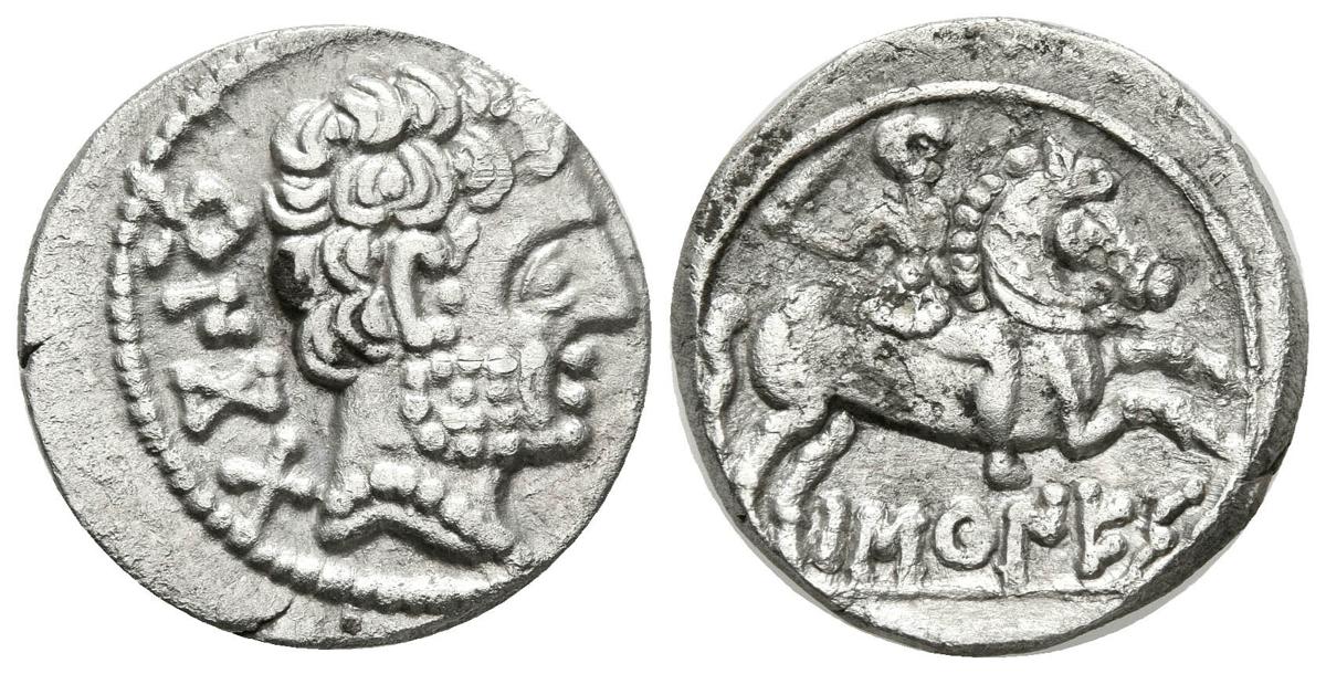 BASCUNES. Denario. 120-80 a.C. Pamplona. A/ Cabeza con barba a derecha, detrás leyenda ibérica BeNCoDa. R/ Jinete con espada a derecha, debajo BaSCuNES. FAB-215. Ar. 3,60g. MBC+.