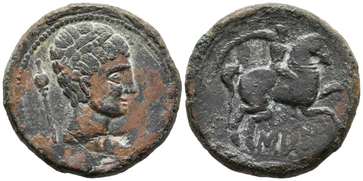 SAITI. As. 120-20 a.C. Xátiva (Valencia). A/ Cabeza masculina a derecha, detrás cetro. R/ Jinete con palma a derecha, debajo SAITi. FAB-2097. Ae. 23,88g. MBC+/MBC.