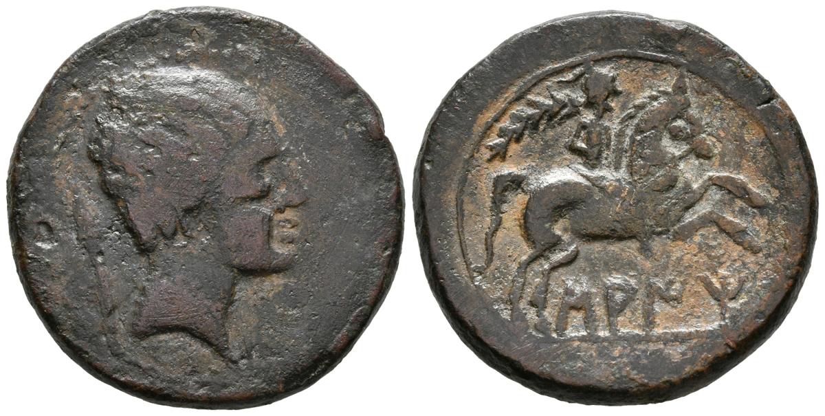 SAITI. As. 120-20 a.C. Xátiva (Valencia). A/ Cabeza masculina a derecha, detrás ¿punta de lanza?. R/ Jinete con palma a derecha, debajo SAITi. FAB-2097var. Ae. 19,69g. BC+/MBC-. Escasa.