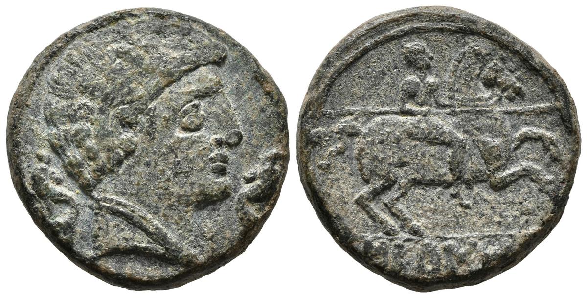 SECAISA. As. 120-20 a.C. Segeda (Aragón). A/ Cabeza masculina con doble collar a derecha entre dos delfines. R/ Jinete con lanza a derecha, debajo SECaISA. FAB-2131. Ae. 9,75g. MBC+.
