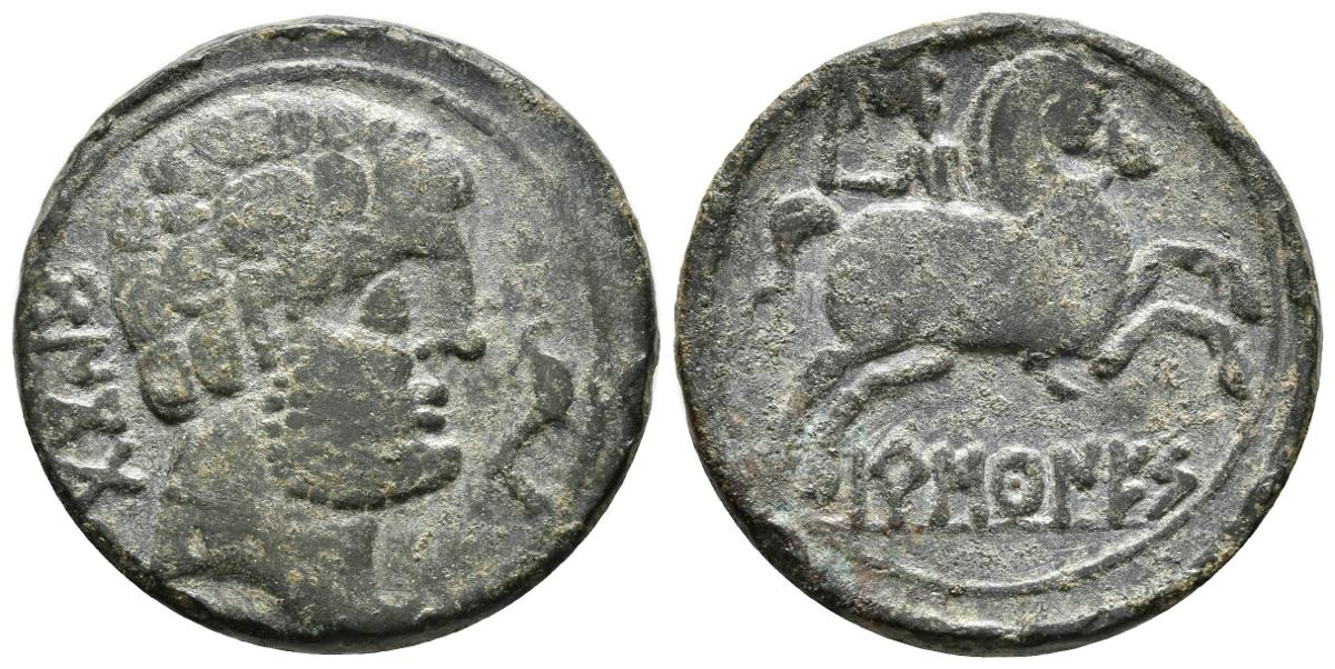 BASCUNES. As. 120-20 a.C. Pamplona. A/ Cabeza barbada a derecha, delante delfín hacia arriba, detrás leyenda ibérica BeNCoDa. R/ Jinete con espada a derecha, debajo leyenda ibérica BaSCuNES. FAB-220. Ae. 11,06g. MBC+.