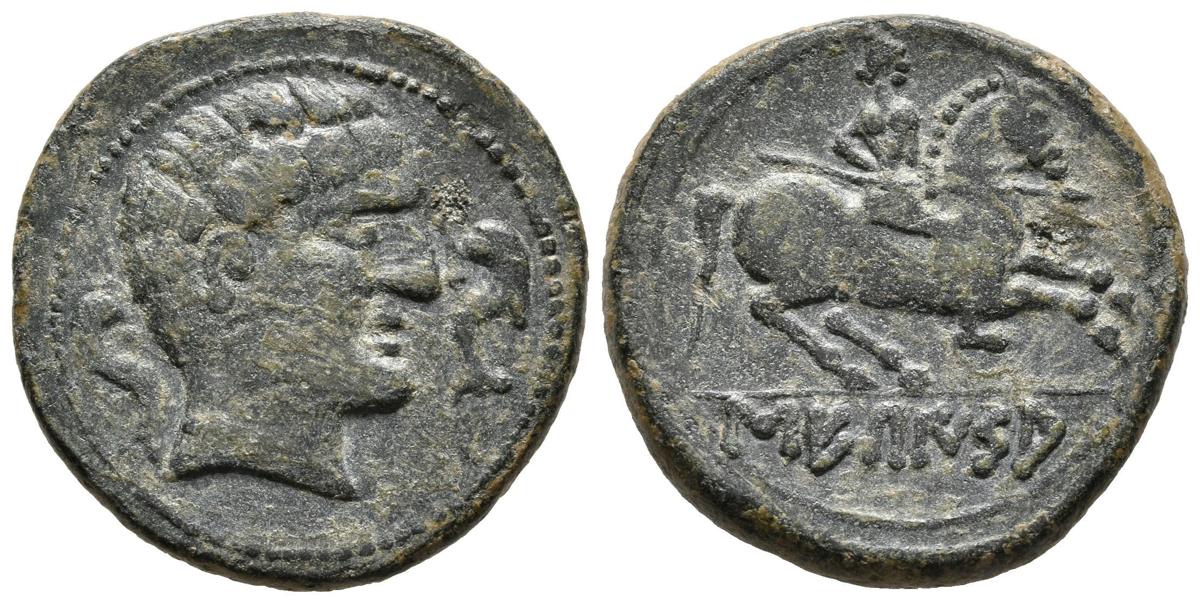SECAISA. As. 120-20 a.C. Segeda (Aragón). A/ Cabeza masculina a derecha entre dos delfines. R/ Jinete con lanza a derecha, leyenda ibérica curva SECaISA. FAB-2137. Ae. 8,48g. MBC+.