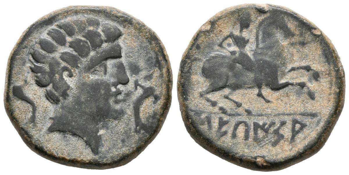 SECAISA. As. 120-20 a.C. Segeda (Aragón). A/ Cabeza masculina a derecha entre dos delfines. R/ Jinete con lanza a derecha, leyenda ibérica curva SECaISA. FAB-2137. Ae. 10,44g. MBC.