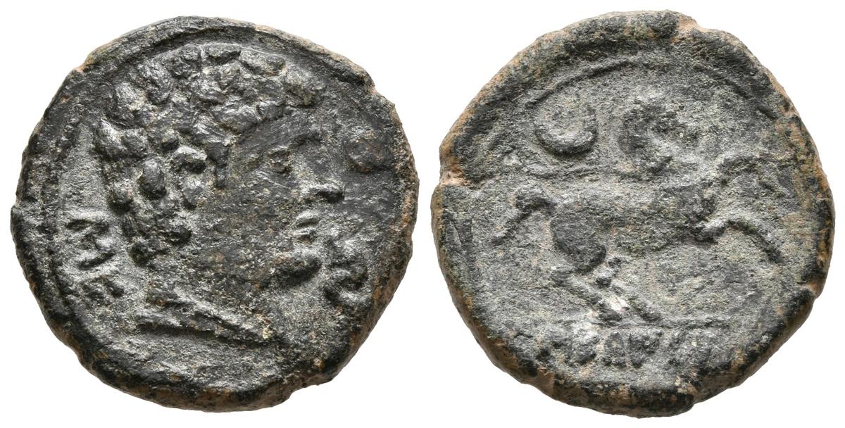 SECAISA. Semis. 120-20 a.C. Segeda (Aragón). A/ Cabeza masculina a derecha, delante delfín y letra ibérica Cu, detrás letras ibéricas SE. R/ Caballo a derecha, encima creciente, debajo SECaISA. FAB-2147. Ae. 5,24g. MBC.