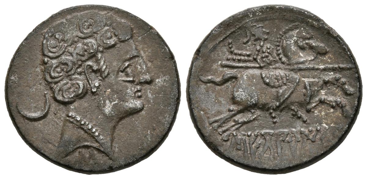 SECOBIRICES. Denario. 120-30 a.C. Saelices (Cuenca). A/ Cabeza masculina a derecha con torque simple, detrás creciente y debajo letra ibérica S. R/ Jinete con lanza a derecha, debajo SECoBiRICeS. (Con clámide y coraza de puntos, ambos pies visibles). FAB-2168. Ar. 3,57g. Pátina. MBC+