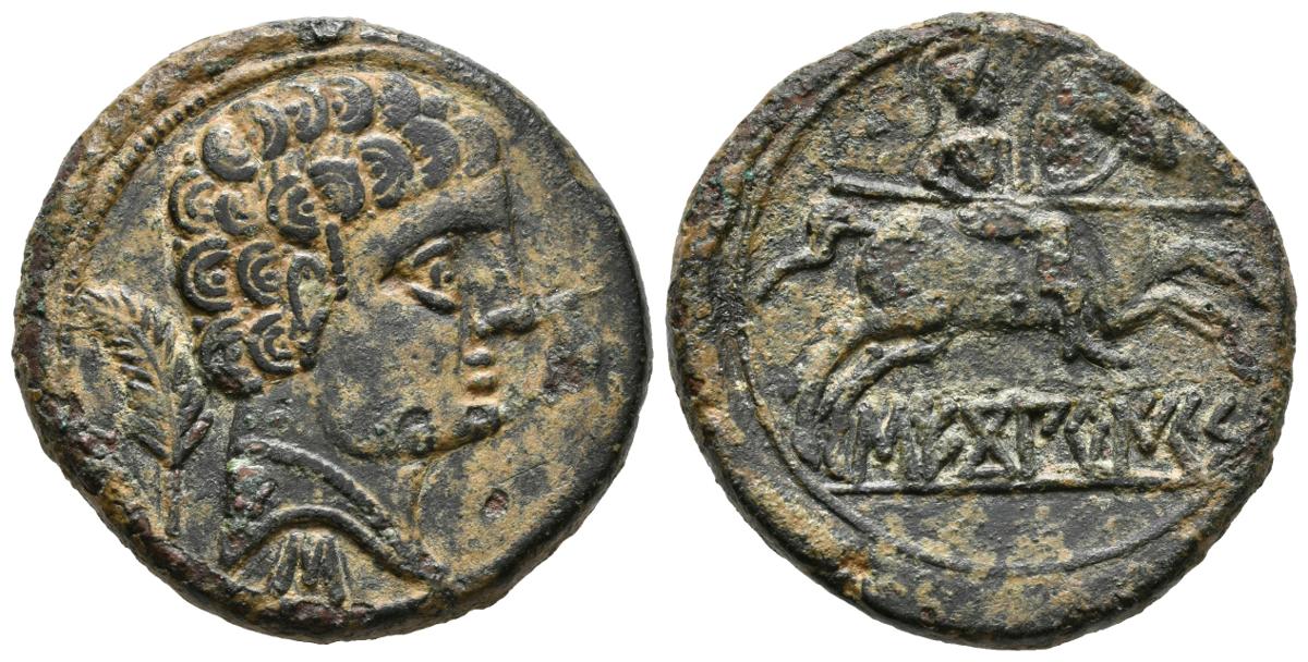 SECOBIRICES. As. 120-30 a.C. Saelices (Cuenca). A/ Cabeza masculina a derecha, delante delfín, detrás palma y debajo letra ibérica S. R/ Jinete con lanza a derecha, debajo SECoBiRICES. FAB-2176. Ae. 9,79g. Buen ejemplar. Leves erosiones en reverso. EBC/EBC-.