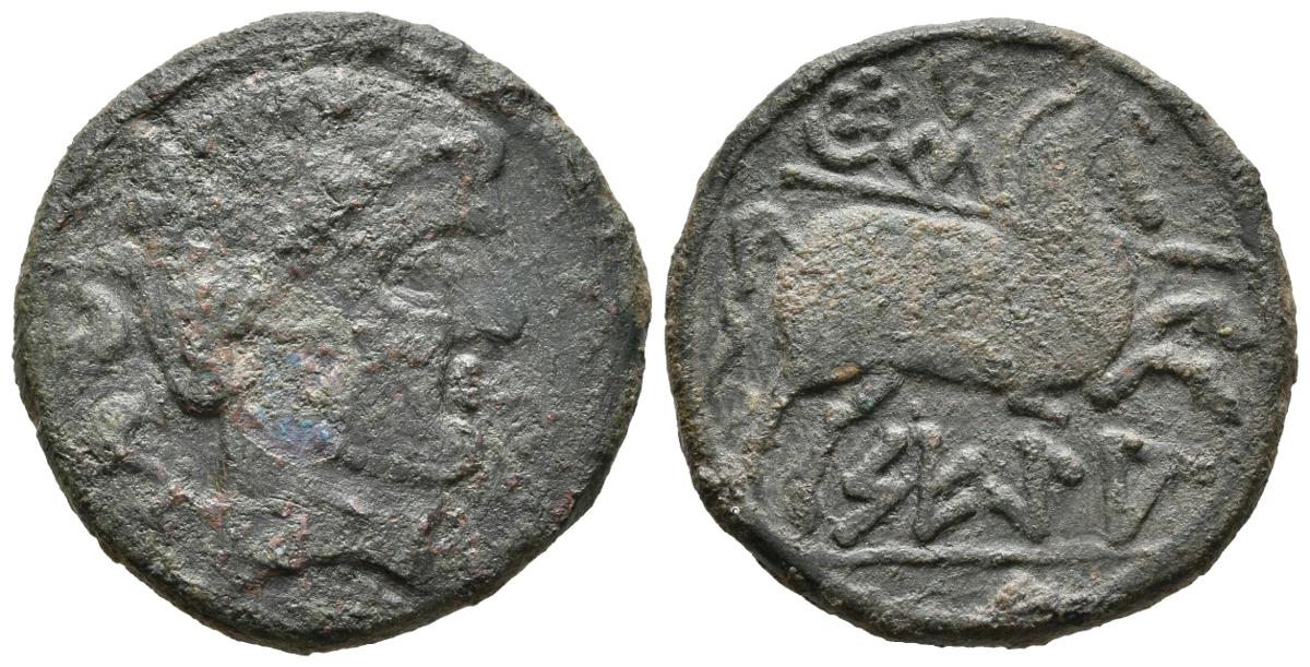 SEGIA-SEKIA. As. 120-20 a.C. Ejea de los Caballeros (Zaragoza). A/ Cabeza masculina barbada y con collar a derecha, detrás dos delfines. R/ Jinete lancero a derecha, encima creciente y estrella, debajo sobre línea SEKIA. FAB-2157. Ae. 10,17g. BC+/MBC.