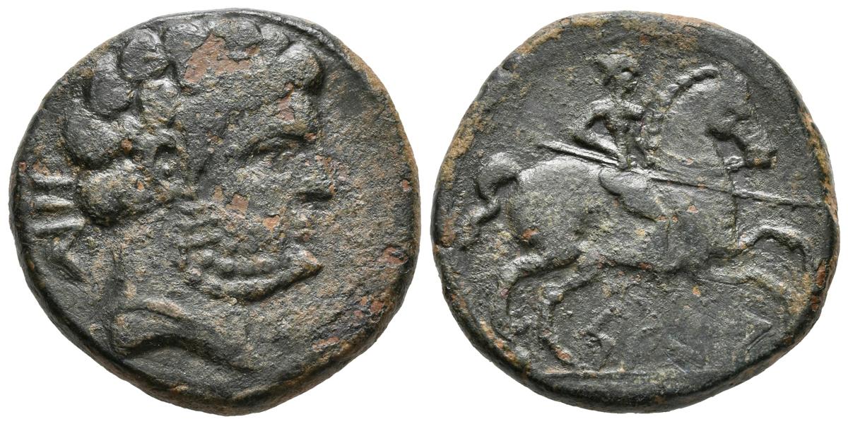 SEGIA-SEKIA. As. 120-20 a.C. Ejea de los Caballeros (Zaragoza). A/ Cabeza masculina barbada y con collar a derecha, detrás letras ON. R/ Jinete lancero a derecha, debajo sobre línea SEGiA. FAB-2160. Ae. 11,87g. MBC.
