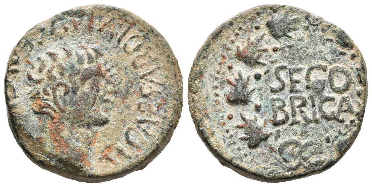 SEGOBRIGA. Semis. Epoca de Tiberio. 14-36 a.C. Saelices (Cuenca). A/ Cabeza desnuda de Tiberio a derecha, alrededor TI.CAESAR DIVI.AVG.F. AVGVS.F.IMP. R/ Corona de roble rodeando la leyenda SEGO-BRIGA. FAB-2190. Ae. 7,76g. MBC/MBC+.