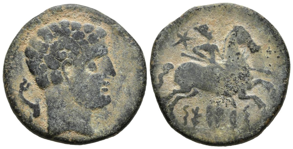 SESARS. As. 120-20 a.C. Zona de Aragón. A/ Cabeza barbada a derecha, detrás delfín. R/ Jinete con lanza a derecha, detrás estrella, debajo sin línea SESARS. FAB-2199. Ae. 11,39g. MBC-. Escasa.