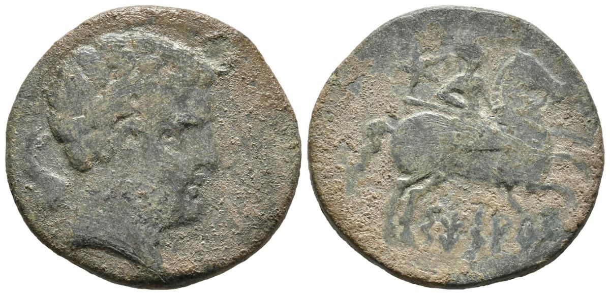 SESARS. As. 120-20 a.C. Zona de Aragón. A/ Cabeza barbada a derecha, detrás delfín. R/ Jinete con lanza a derecha, detrás estrella, debajo sin línea SESARS. FAB-2199. Ae. 11,58g. BC/MBC-. Escasa.