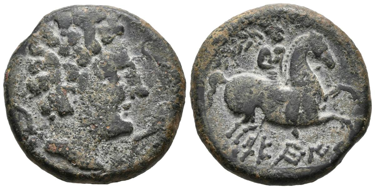 SETEISCEN. As. 120 - 20 a.C. Sástago (Zaragoza). A/ Cabeza masculina rodeada de tres delfines. R/ Jinete con palma a derecha, debajo sobre línea leyenda SETeIS. FAB-2215. Ae. 16,54g. MBC-/MBC. Escasa.