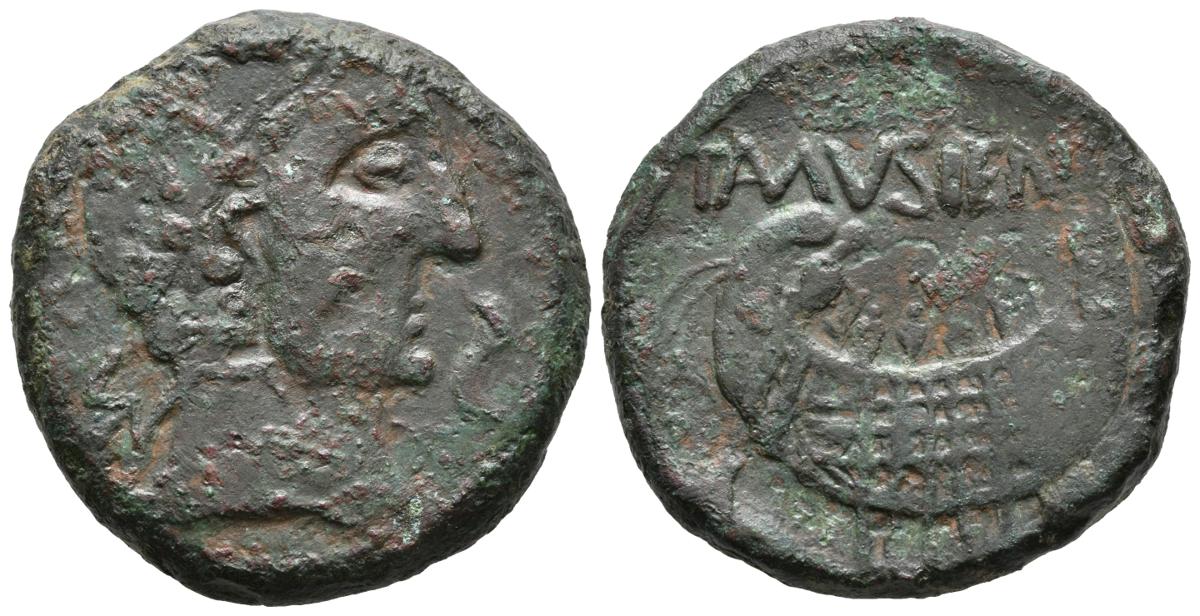 TAMUSIENS. As. 50 a.C. Zona suroeste de la península. A/ Cabeza masculina a derecha, delante delfín, detrás letras ibéricas TaM. R/ Embarcación a derecha con tres remeros y timonel, encima TAMUSIENSI. FAB-2263. Ae. 21,86g. Buen ejemplar para esta ceca. MBC+. Muy rara.